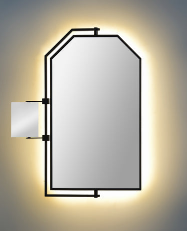 A framed backlit mirror with a swinging arm and frameless magnified mirror attached.