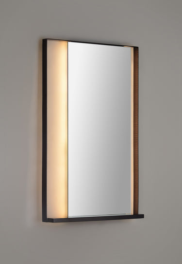 Experience the convenience and sophistication of the 16064 James Vanity. Its integrated backlit panel mirror, featured in a sleek matte black frame with an amenity shelf, elevates the functionality of your space. Accomplish your grooming and styling needs with ease and elegance.