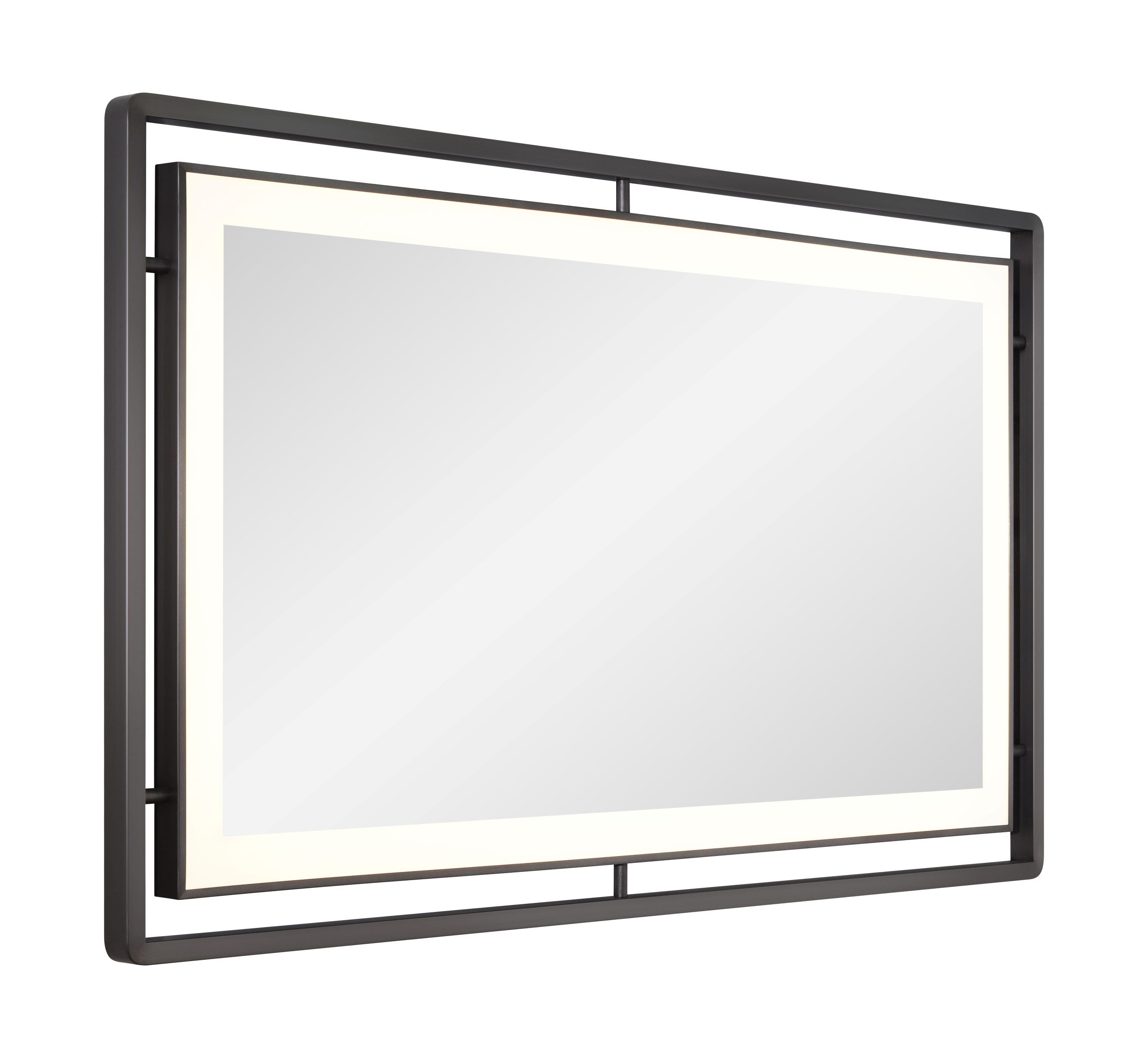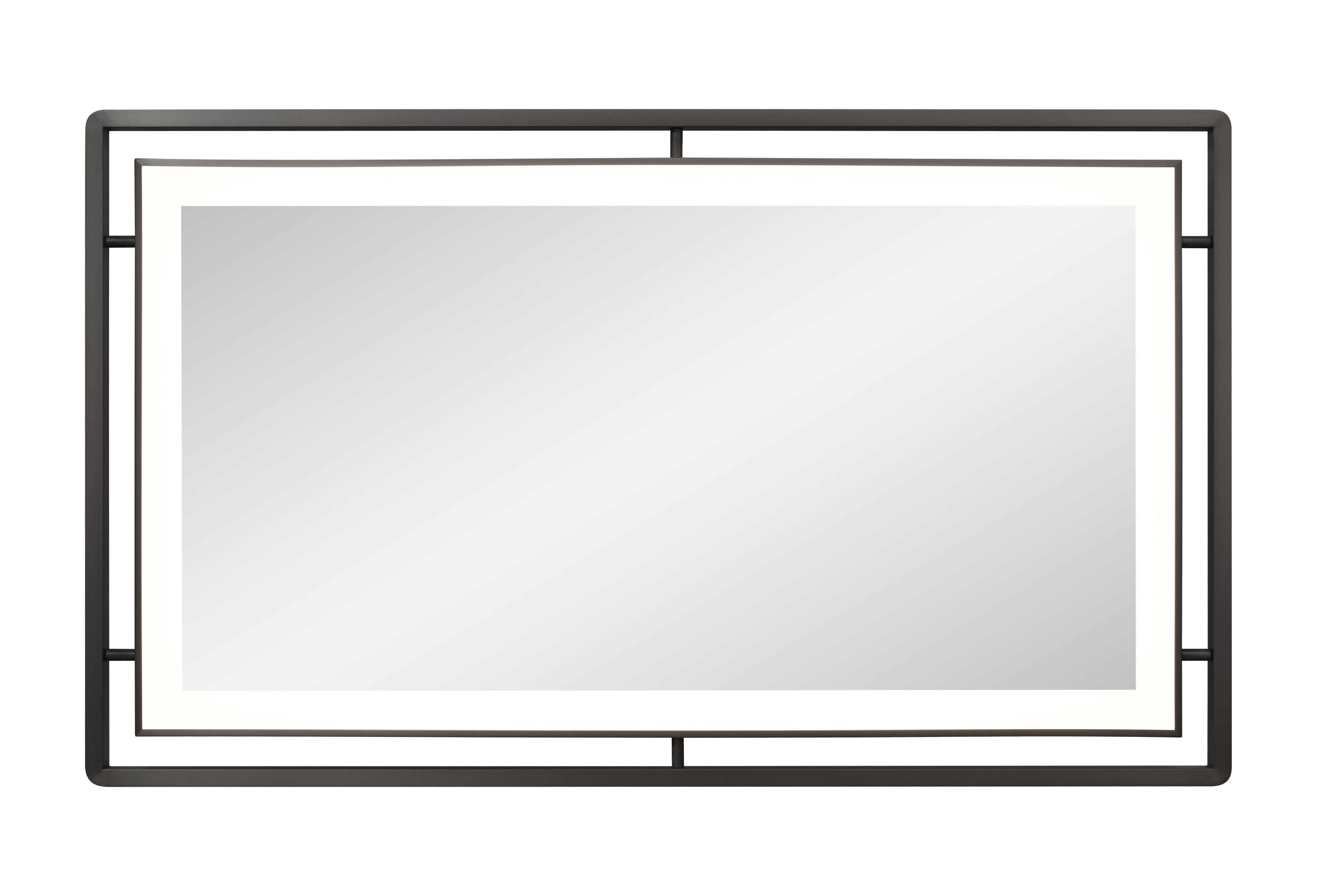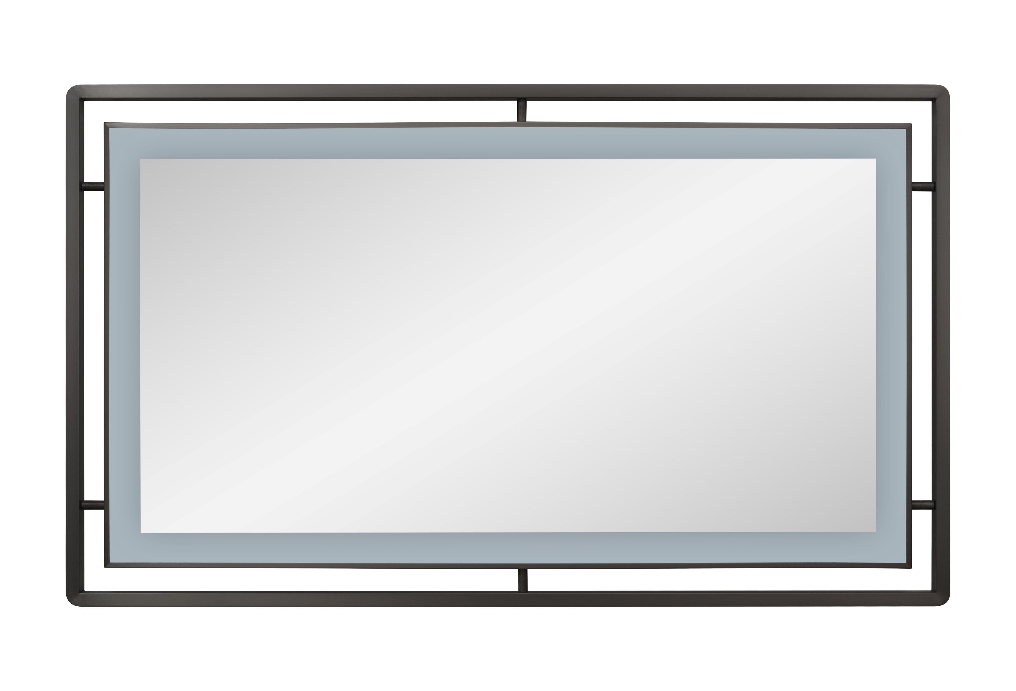 This lit mirror features a durable stainless-steel frame with a plated black nickel finish for a sleek and modern look. The rectangle shape adds a touch of sophistication to any space. The textured connecting tubes add a unique detail to this functional and stylish mirror.