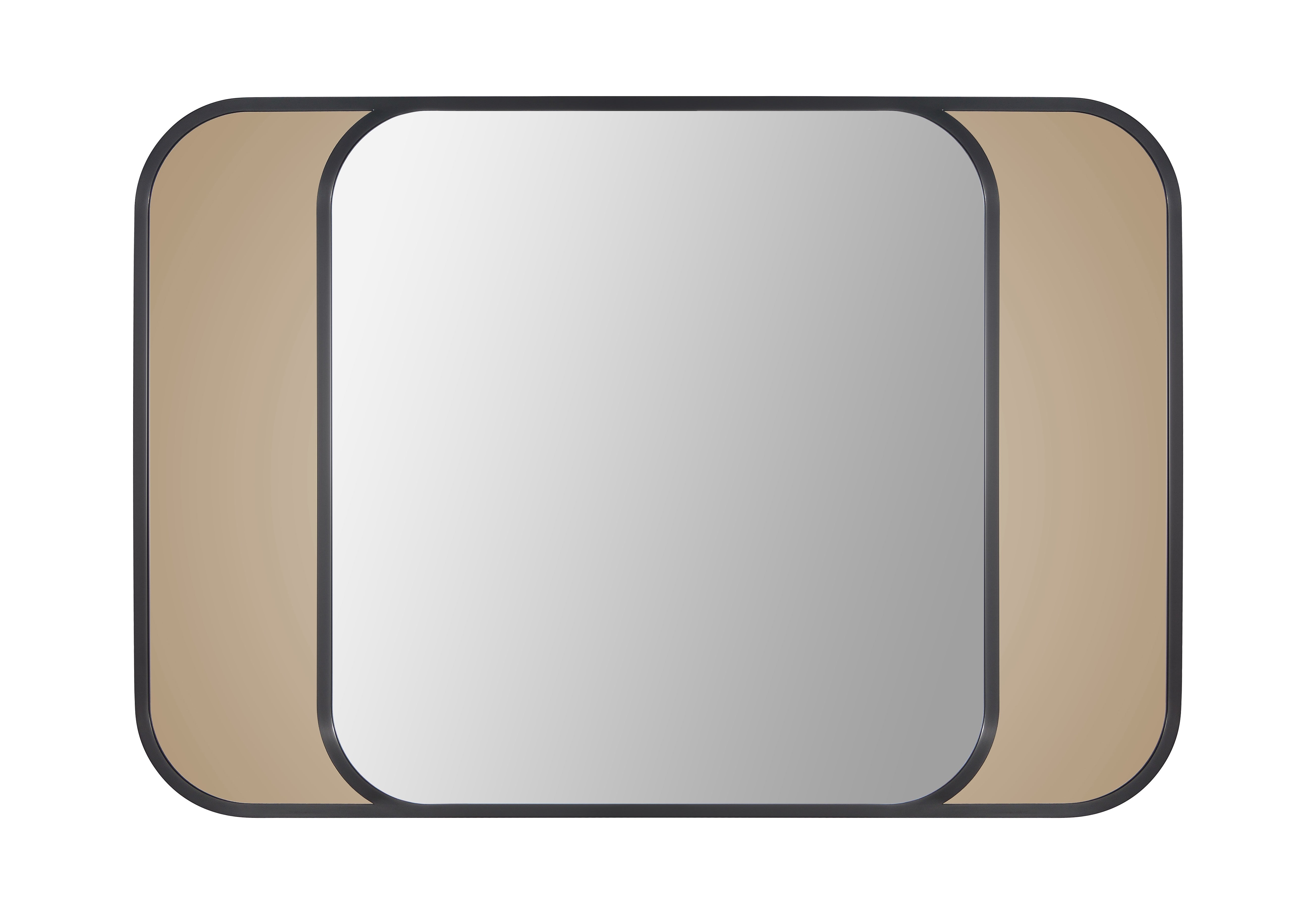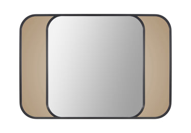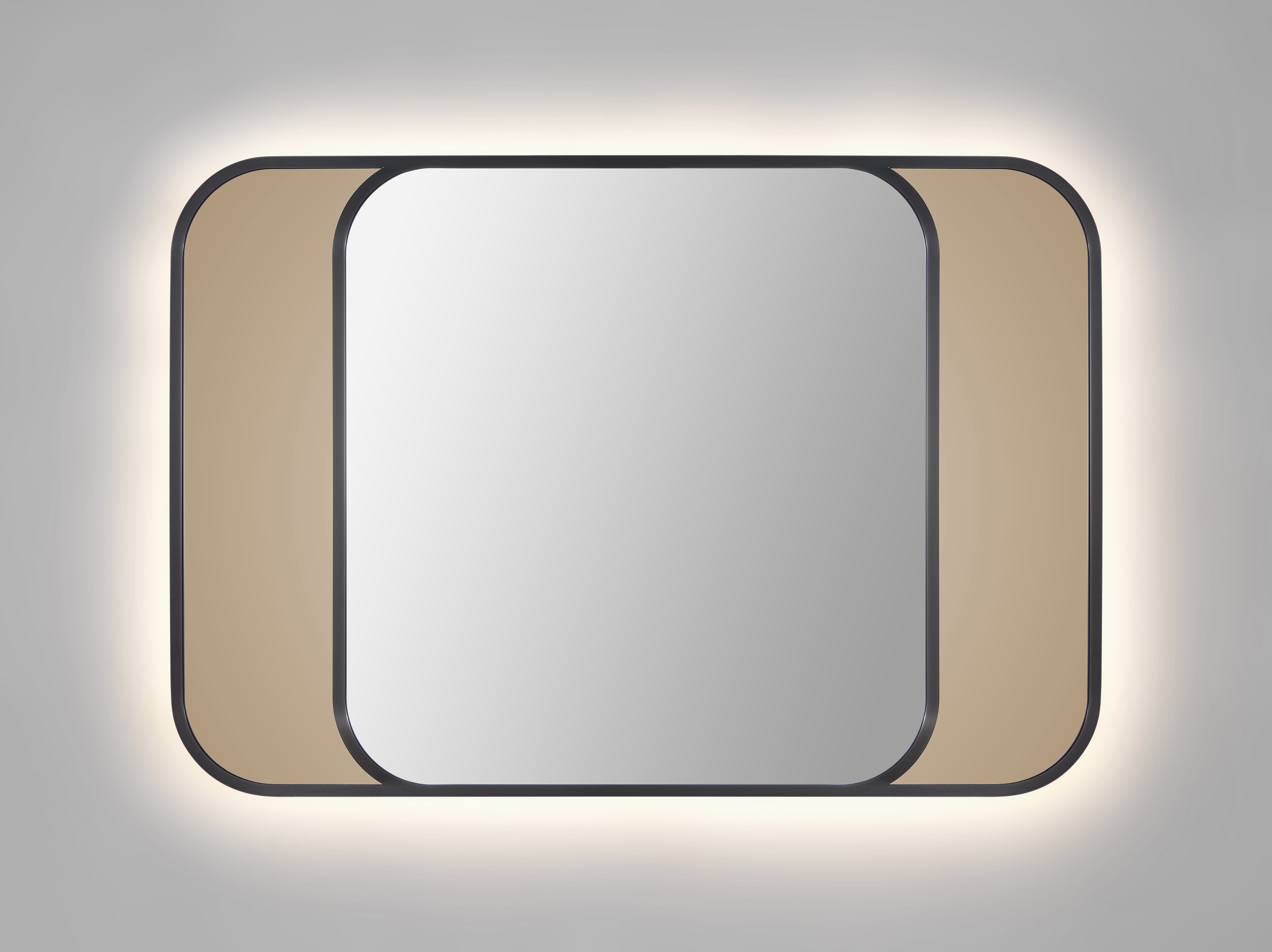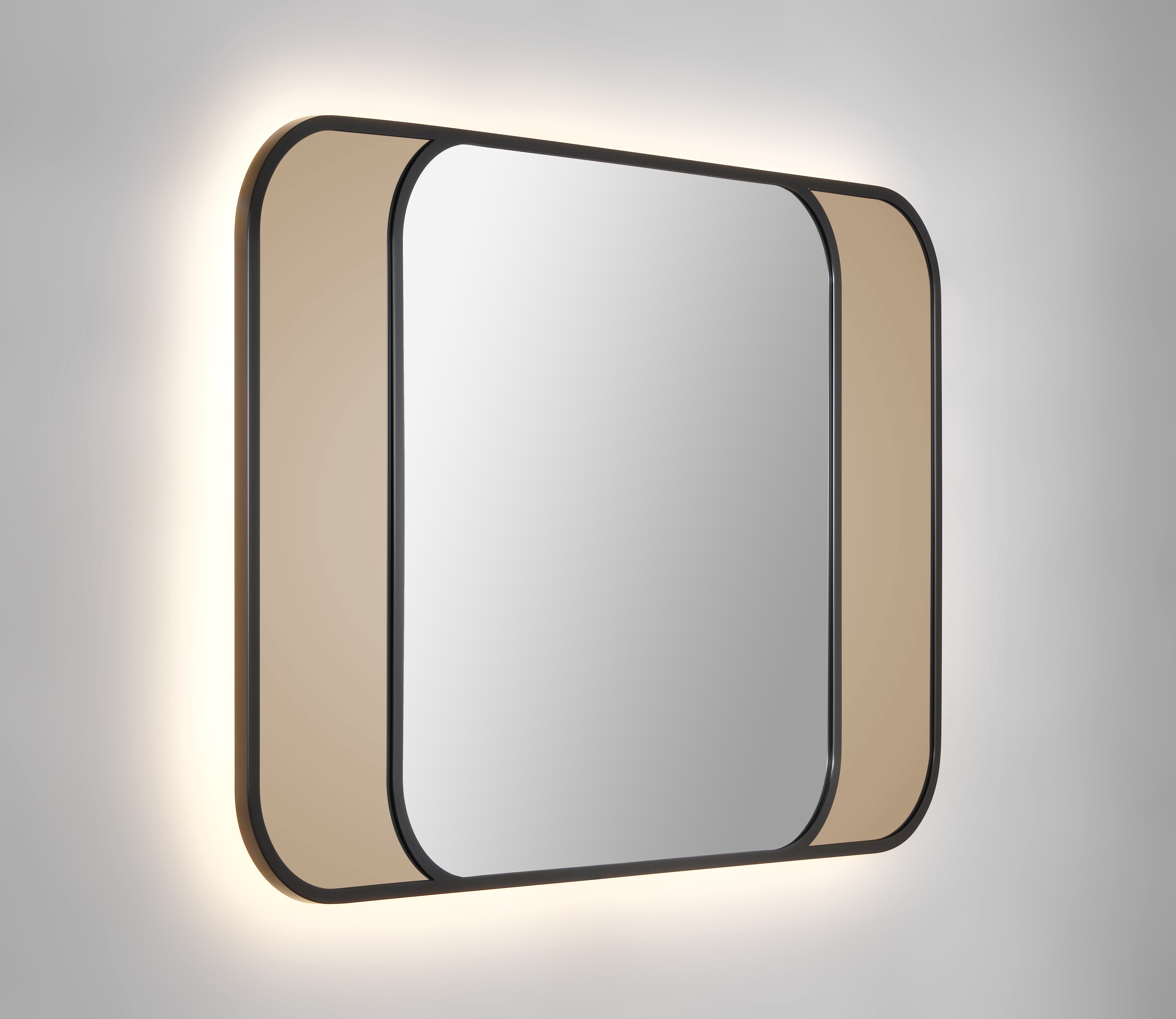 This square mirror features rounded corners, an extended gold frame on both sides, and backlit lighting. Experience increased visibility and a touch of elegance in any room.