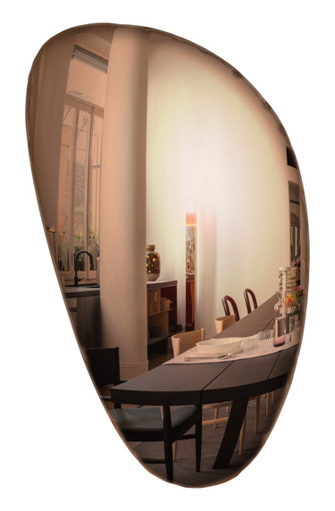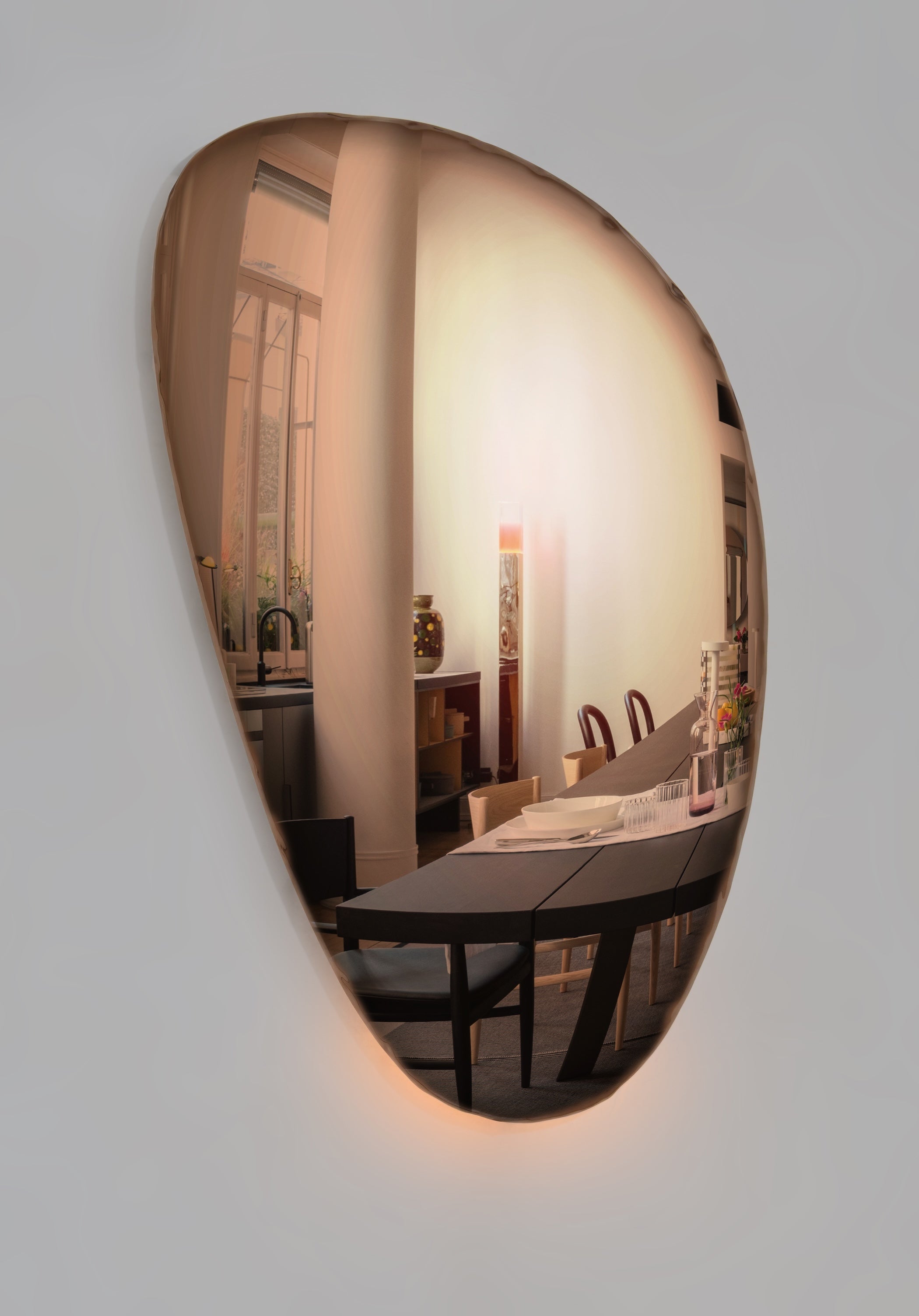 This frameless mirror features a unique silhouette paired with a warm bronze-colored backlit, creating an elegant and modern decorative accent. Its sleek design enhances any space by providing ambient lighting and a subtle glow, perfect for adding depth and sophistication to interiors.
