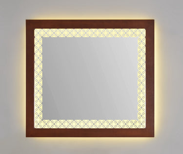 DESCRIPTION: FAUX LEATHER FRAMED MIRROR WITH CUSTOM BACKLIT ETCHED PATTERN SHOWN IN 2700K