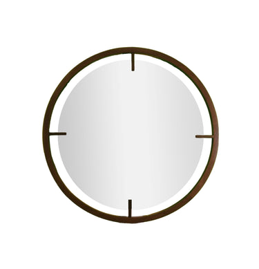 This 16353 mirror features a round frame crafted from woodtone finish and painted bronze metal clips, giving it a classic, timeless feel. The contemporary floating design adds visual appeal to any space, creating an eye-catching contrast for a unique look.