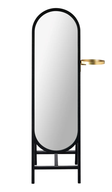 This freestanding mirror features a sturdy wood frame and a stylish black stain finish, the round metal tray allows for easy organization and adds a touch of elegance.