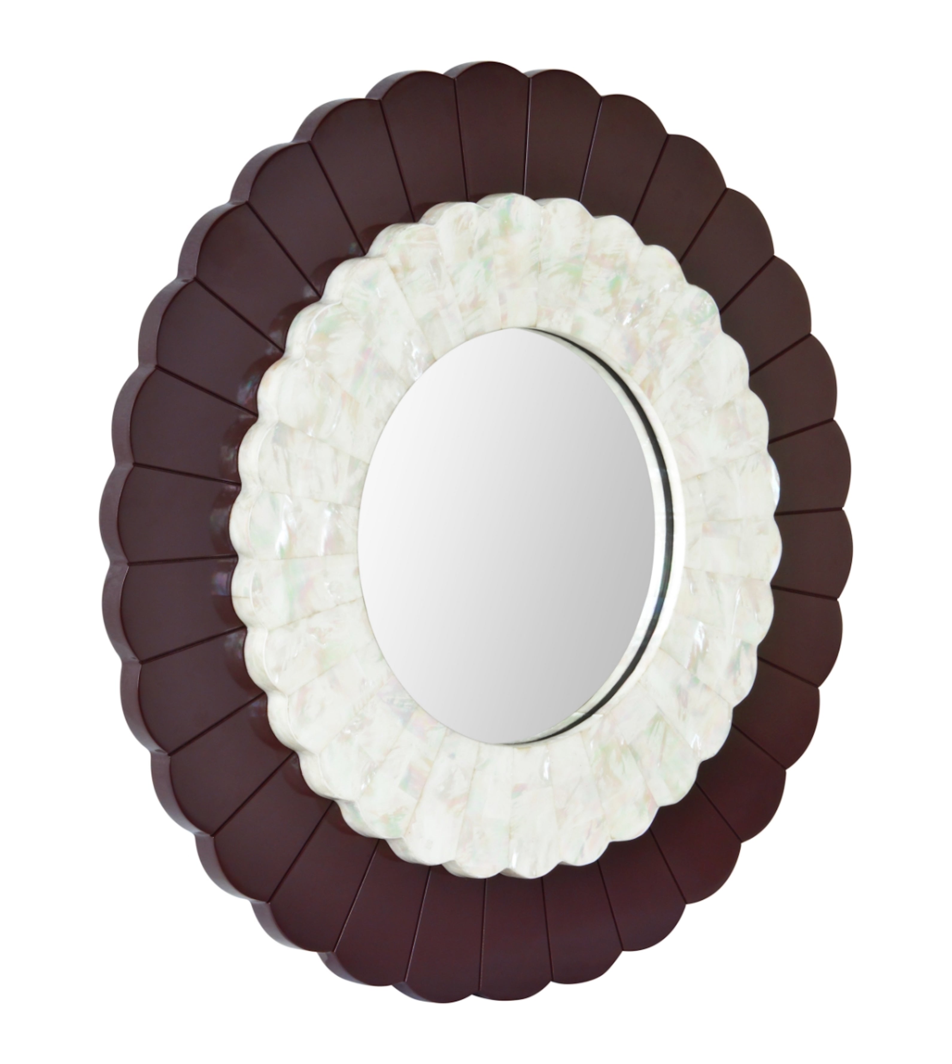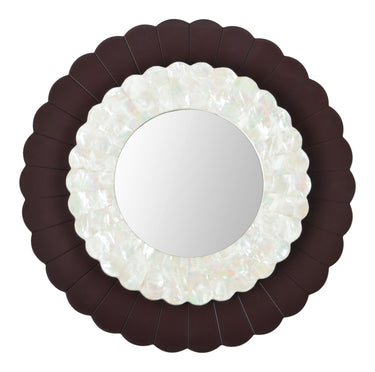 This expertly crafted round mirror features a sophisticated two-tone frame in brown and white, highlighting intricate detailing that enhances its visual appeal. Its balanced design complements various decor styles, making it a refined choice for adding depth and elegance to any space.
