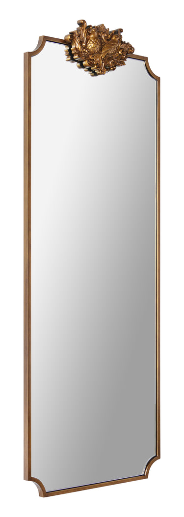 Full Length Decorative Mirror with hand carved bird figurine and scalloped corners. Shown in Antique Brass