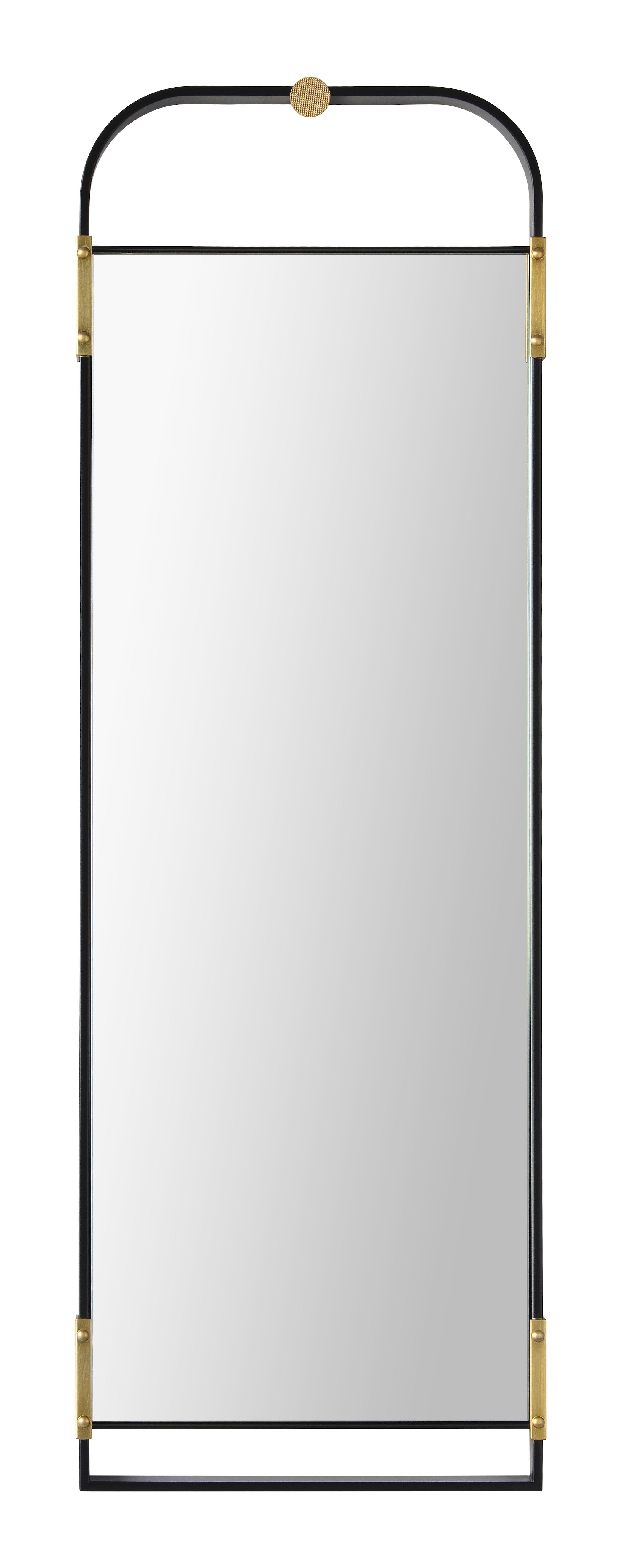 Full Length Mirror in blackened iron frame with burnished brass accents and decorative hook