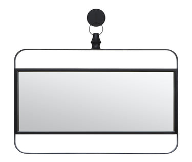 Horizontal framed mirror with custom finish with inseam and decorative finial ring.