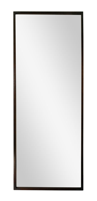 Custom Full length mirror shown in a custom stained wood frame and oil rubbed bronze decorative metal brackets.