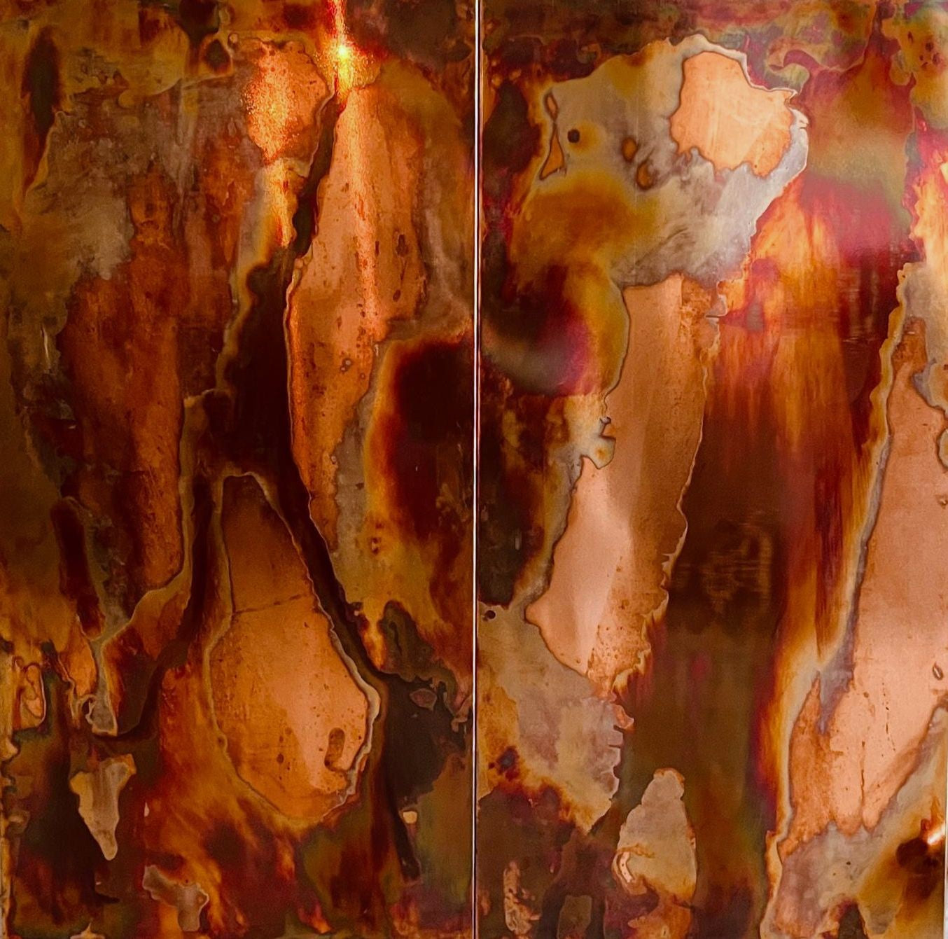 Experience the mesmerizing beauty of Copper Flames. This stunning mix of copper, yellow, red, and orange creates a wild and unique design. Elevate your decor with the warm and vibrant colors of Copper Flames.