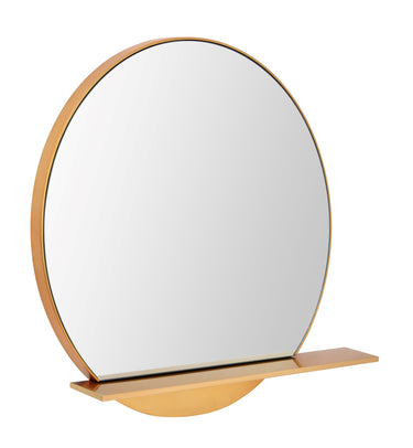 This metal framed round mirror features a sleek satin black finish and a built-in metal shelf for added functionality.