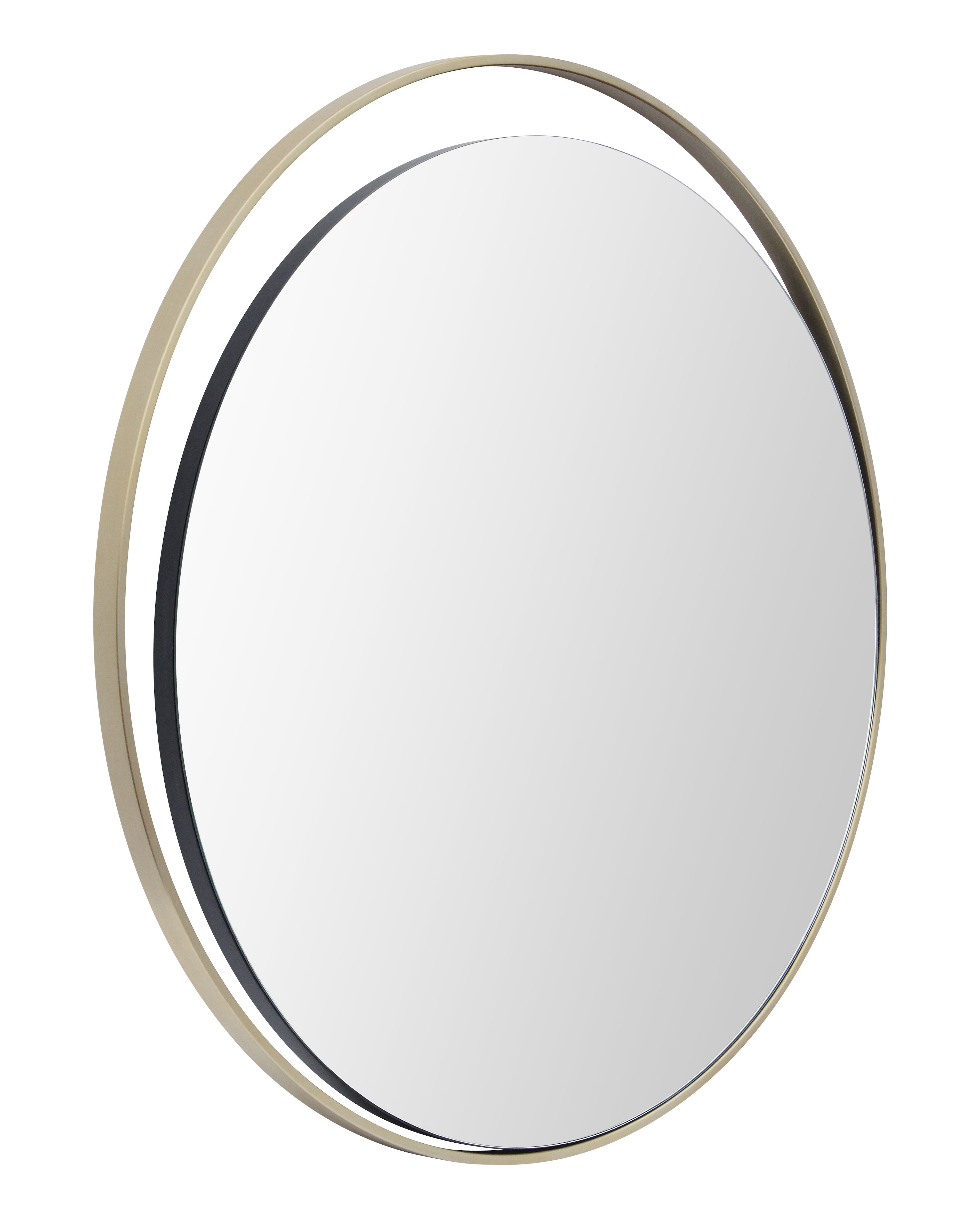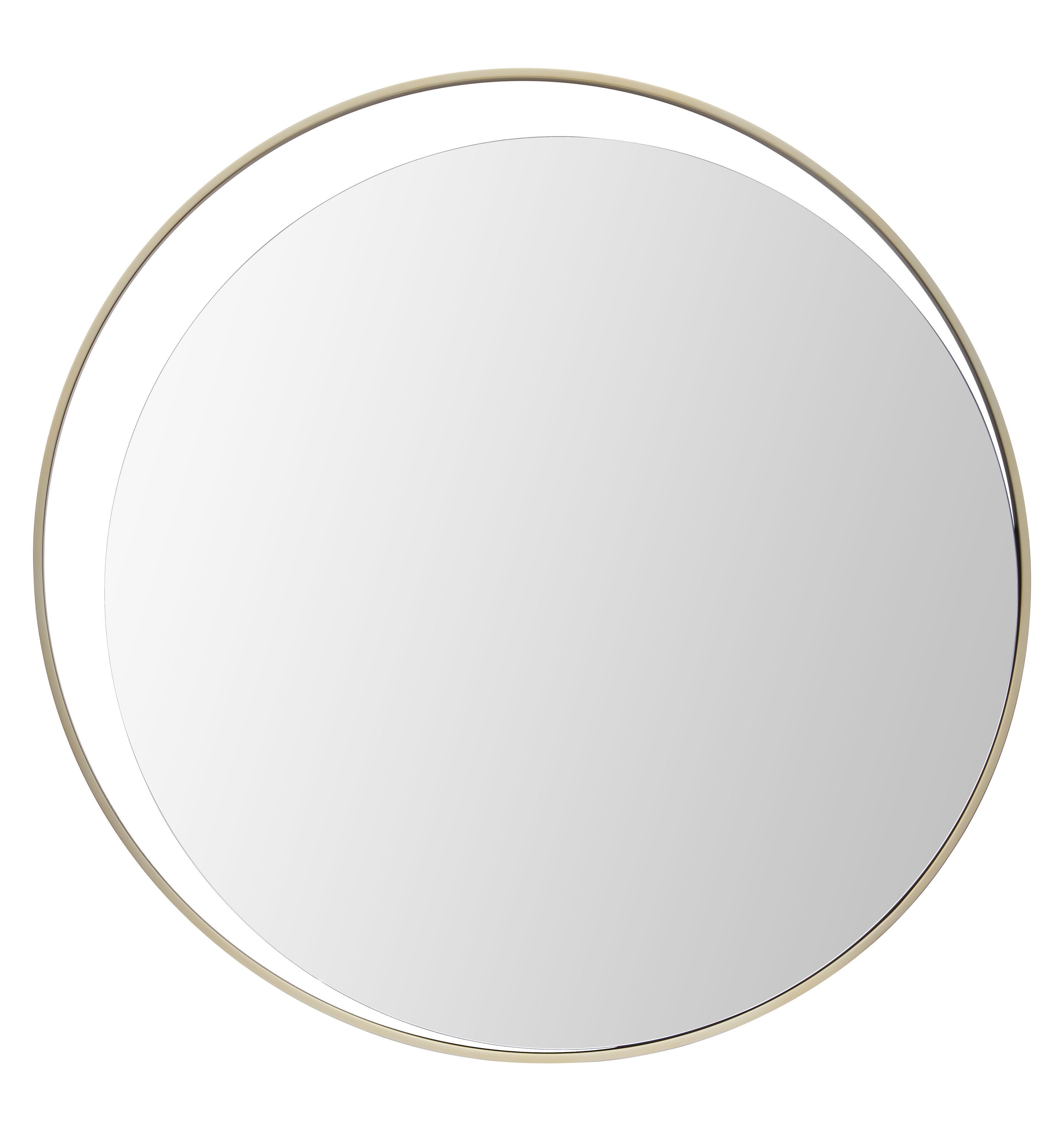 Enhance your room's aesthetic with our 16623 round mirror featuring a gold frame and a unique waning crescent moon design. The gap between the frame and mirror adds a modern touch and allows for easy hanging. Elevate your space with this elegant and functional piece.