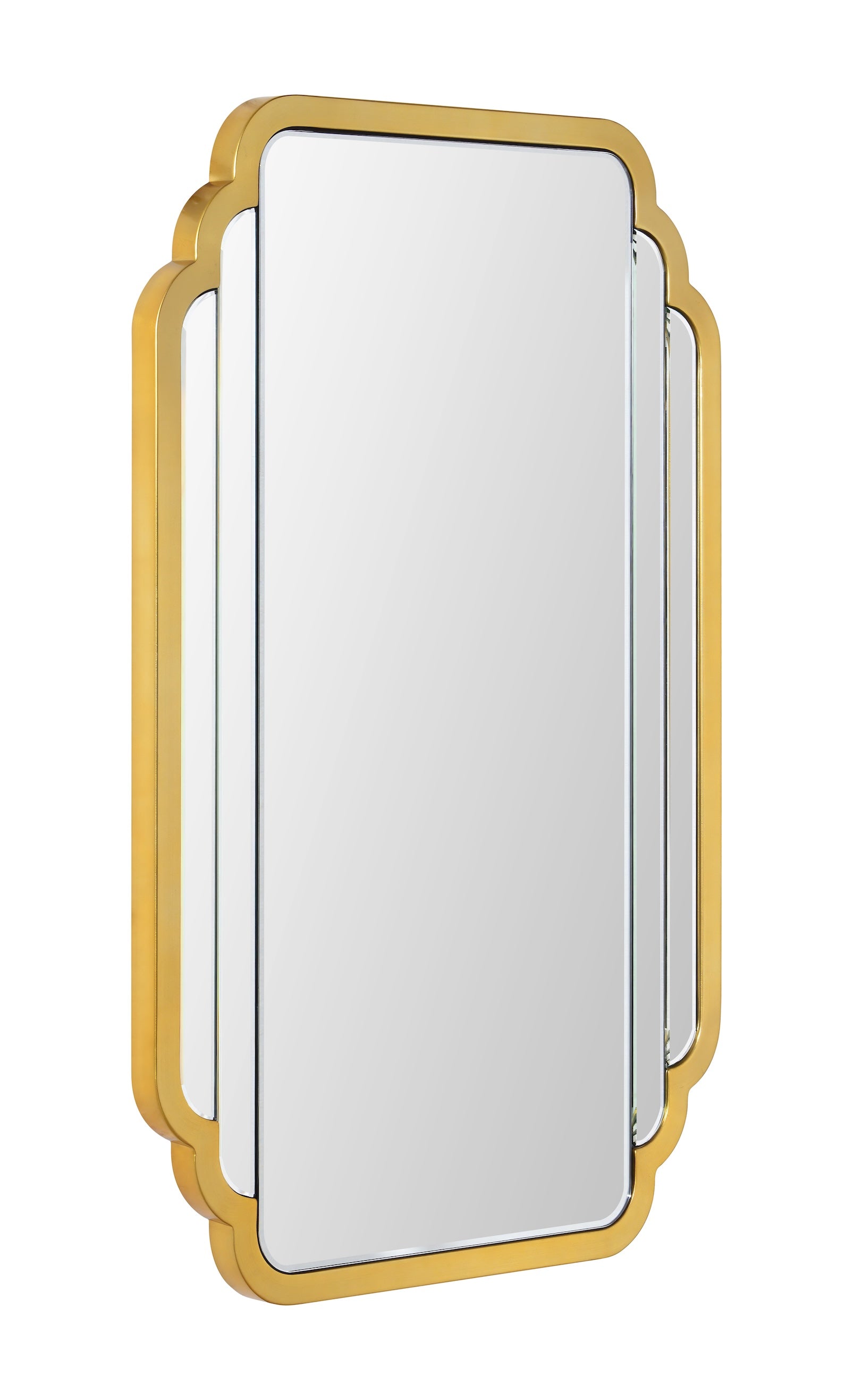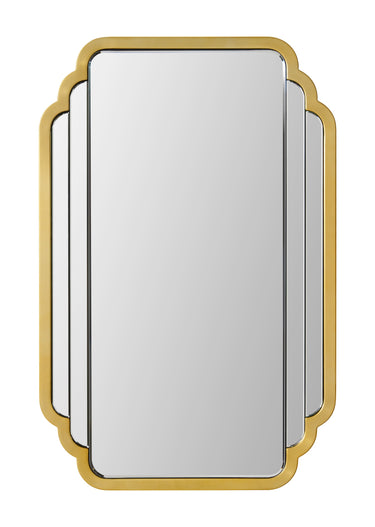 Elevate your space with this distinctive mirror featuring an unconventional geometric frame in warm bronze. The unique silhouette serves as both functional reflection and sculptural wall art, adding architectural interest to any room.