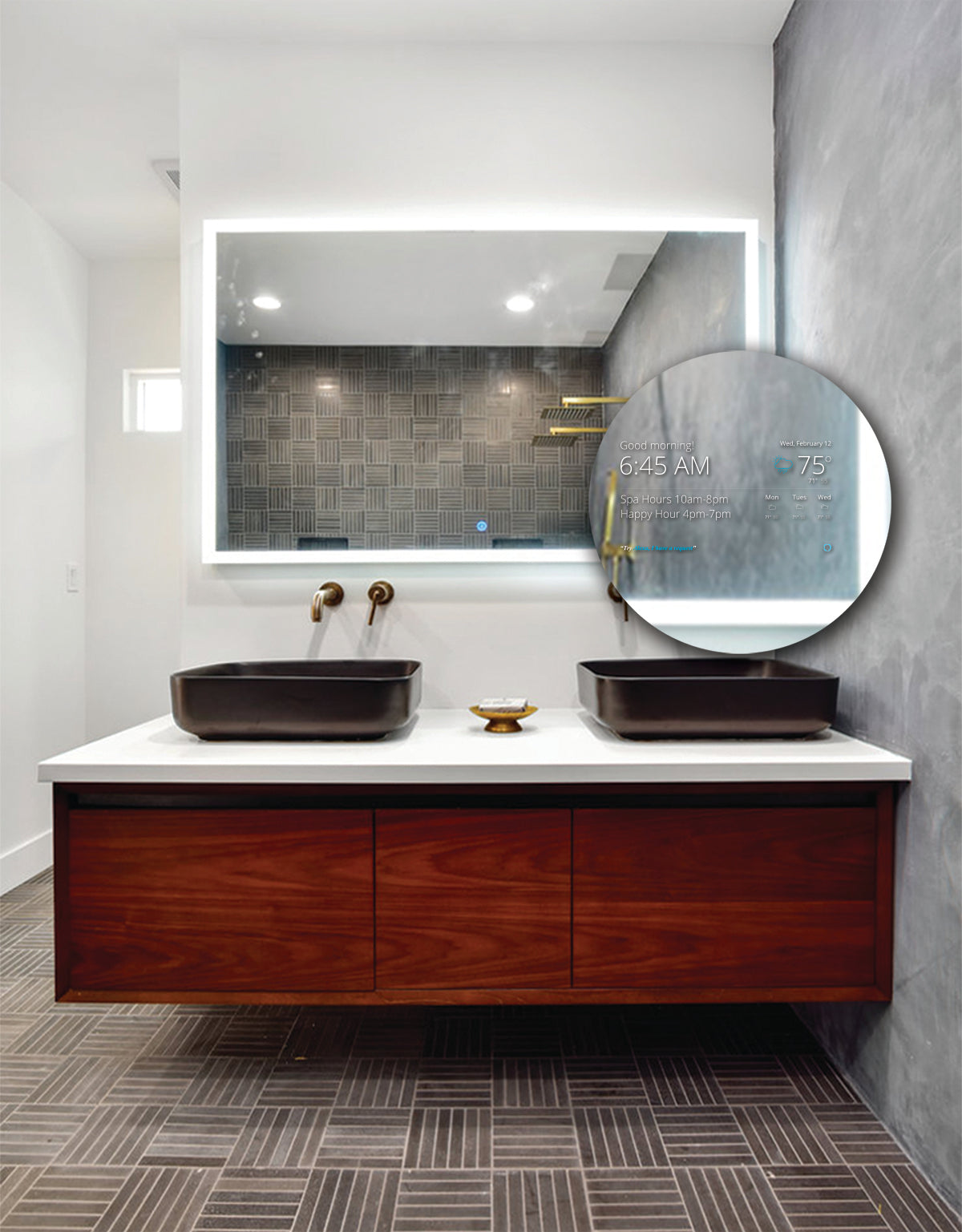 Mirror Image Plus offers built-in Bluetooth speakers, device charging, defoggers, dimmers, customizable lighting, motion sensors, nightlights, smart weather and clock displays, and full smart mirror integration.
